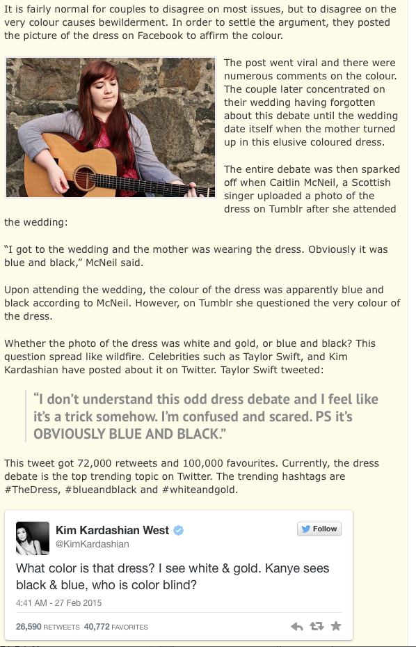 The past two days have been crazy. Everyone’s sick of hearing about the dress. But yet, it is possibly one of the most interesting things I have come across in quite awhile. I was baffled when my husband and I saw the same photo on the same phone DIFFERENTLY. I saw it as gold & white and he saw it as blue and black. LIKE SERIOUSLY?!