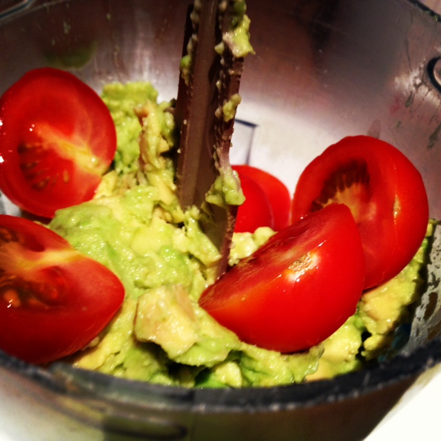 • Mash avocado.  Put it into a blender/chopper with cherry tomatoes cut into halves.  Blend till its a creamy paste.