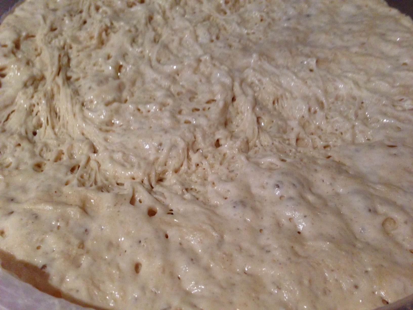 After 5 hours, it will look like this!  It’s extremely slimy to work with (on the first day)… But this is the dough!